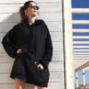 Abito oversize con cappuccio e tascone , taglio ad ovetto .